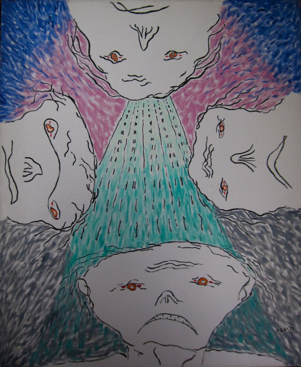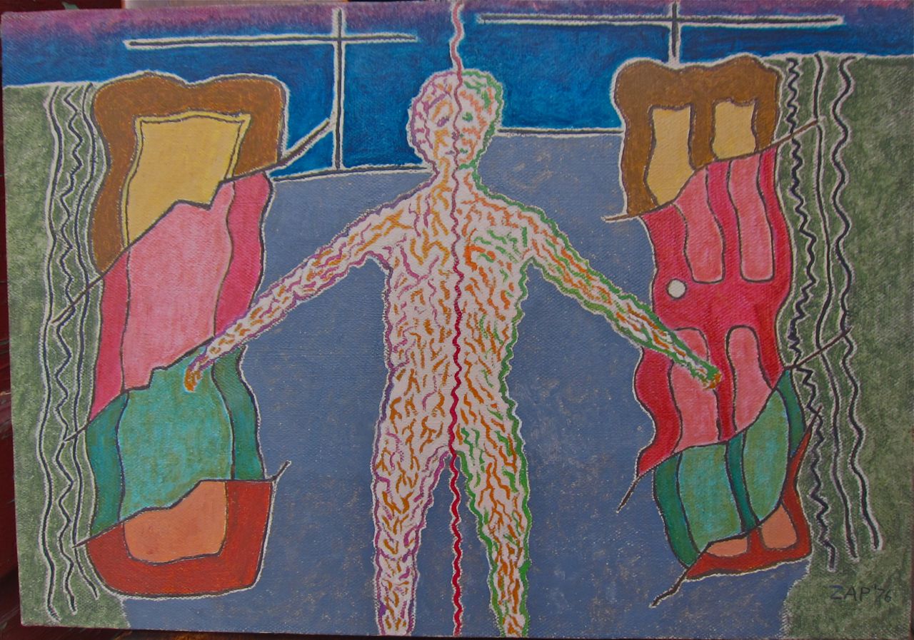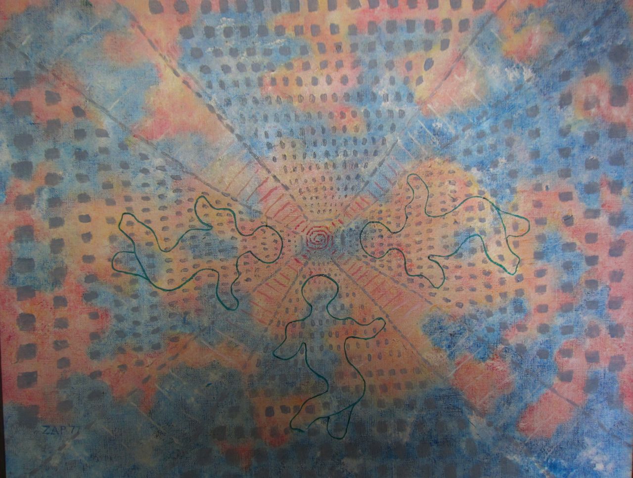 Nathan painted during two brief periods of his life. 1951-52 and 1976-79 with most of his paintings produced in 1977-78.’ His technique might be regarded as basic (he was entirely self-taught), but many of the images have powerful visual elements that seem like X-rays of the unconscious. The images are always concise, never busy, and there is strong sense of visual authority. In the spring of 2012 when I encountered these paintings again while doing some work at my parent’s house I was astonished at how many of the images had symbols of the singularity archetype. Most of the paintings featured spirals and some seemed to be images of what, in my book, Crossing the Event Horizon—Human Metamorphosis and the Singularity Archetype, I call “homo gestalt”— a telepathic network. Another parallelism is that my dad’s most prolific year for painting, 1978, was the same year that I began work on the Singularity Archetype and wrote about it in a philosophy honors paper, Archetypes of a New Evolution. I recently wrote an oracle card based on my dad: No Safe Walk Through Life. When I showed my parents a slide show of the paintings on my laptop, my mom, who recently read my book, was also astonished at the profusion of Singularity Archetype motifs. She asked my dad (who turned 93 that week and has some cognitive issues) what he meant by all the spirals. “They were meant to be symbolic.” he replied. “Symbolic of what?” she asked. “I’m not sure, space possibly.” he replied.