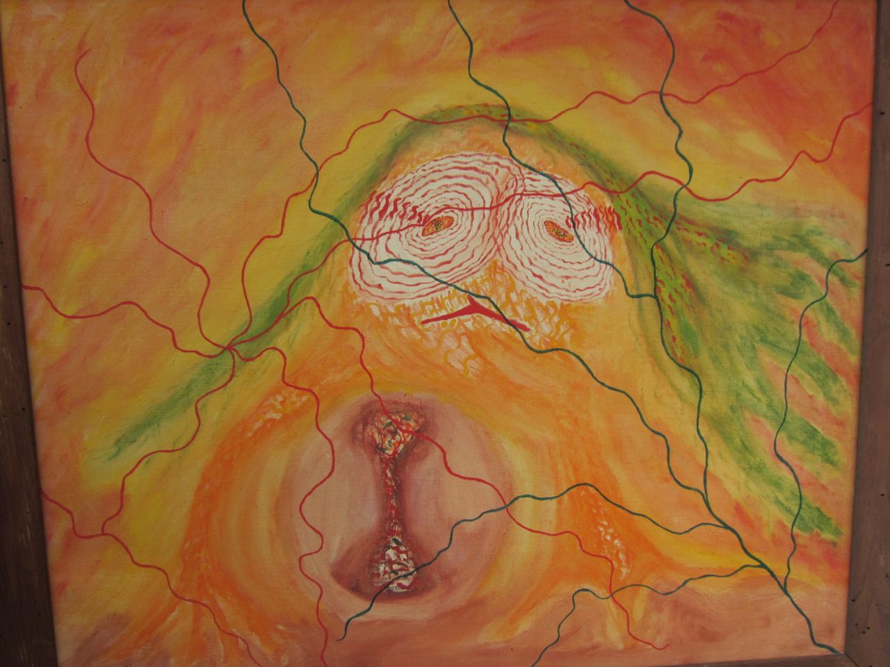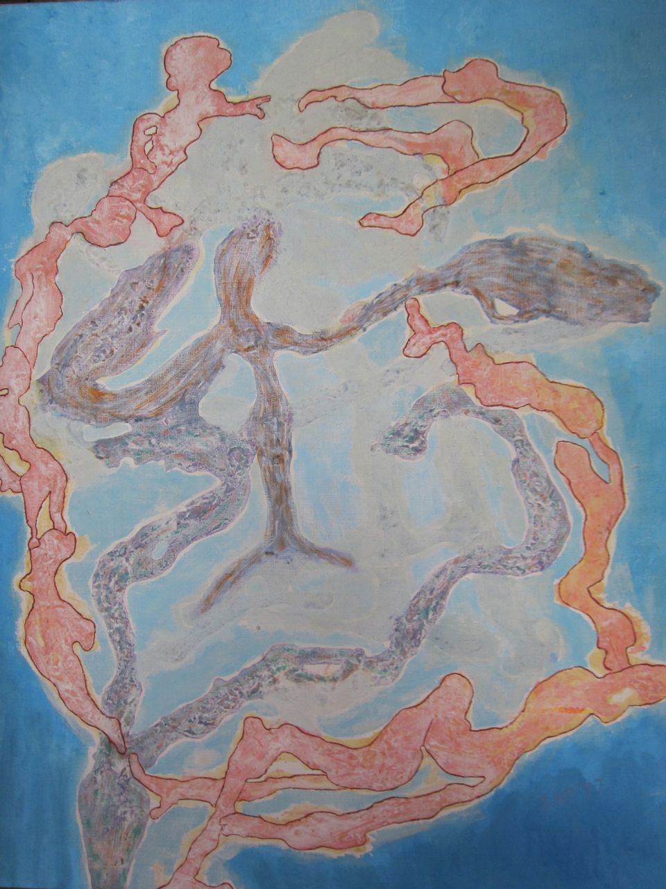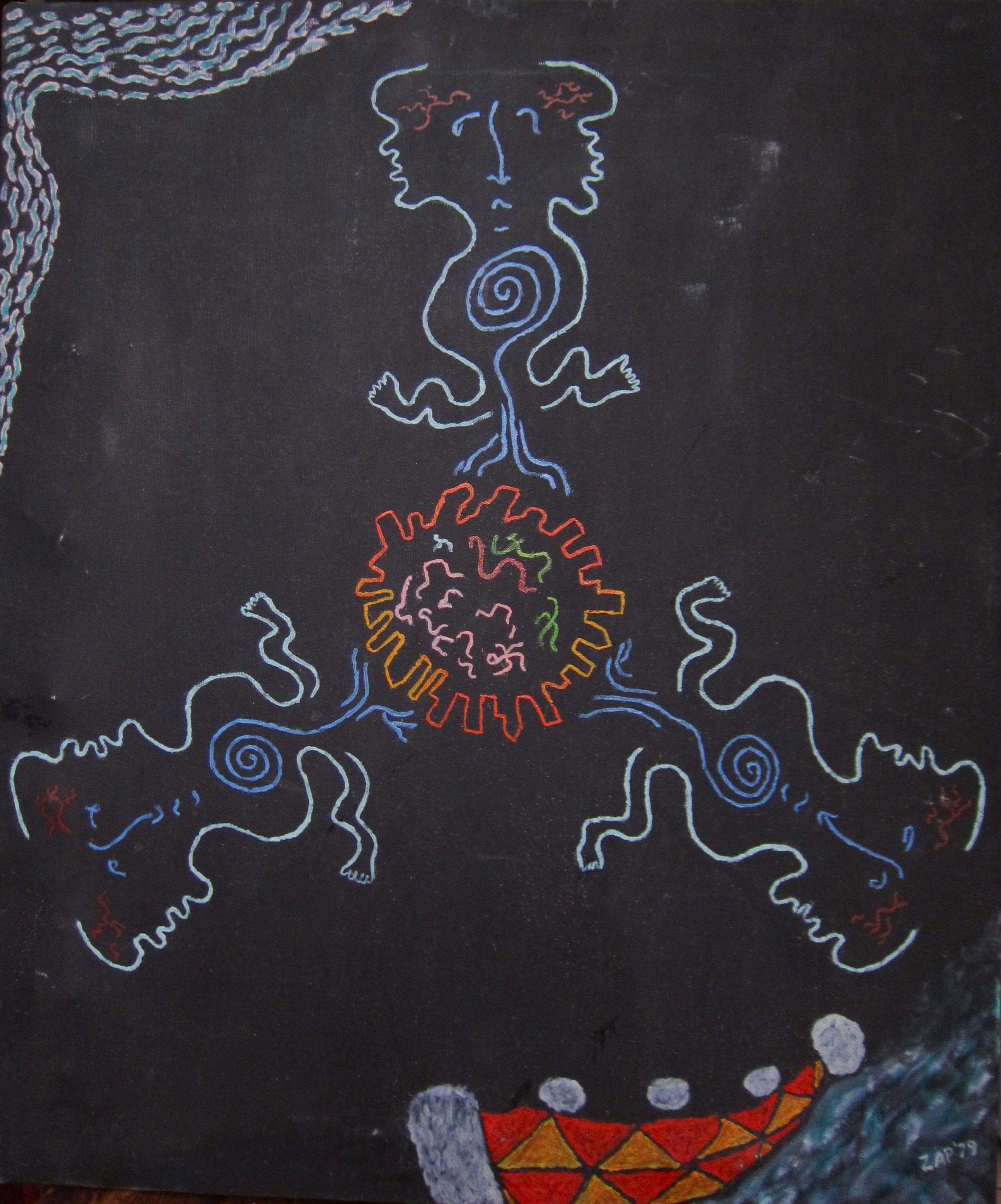 Nathan painted during two brief periods of his life. 1951-52 and 1976-79 with most of his paintings produced in 1977-78.’ His technique might be regarded as basic (he was entirely self-taught), but many of the images have powerful visual elements that seem like X-rays of the unconscious. The images are always concise, never busy, and there is strong sense of visual authority. In the spring of 2012 when I encountered these paintings again while doing some work at my parent’s house I was astonished at how many of the images had symbols of the singularity archetype. Most of the paintings featured spirals and some seemed to be images of what, in my book, Crossing the Event Horizon—Human Metamorphosis and the Singularity Archetype, I call “homo gestalt”— a telepathic network. Another parallelism is that my dad’s most prolific year for painting, 1978, was the same year that I began work on the Singularity Archetype and wrote about it in a philosophy honors paper, Archetypes of a New Evolution. I recently wrote an oracle card based on my dad: No Safe Walk Through Life. When I showed my parents a slide show of the paintings on my laptop, my mom, who recently read my book, was also astonished at the profusion of Singularity Archetype motifs. She asked my dad (who turned 93 that week and has some cognitive issues) what he meant by all the spirals. “They were meant to be symbolic.” he replied. “Symbolic of what?” she asked. “I’m not sure, space possibly.” he replied.