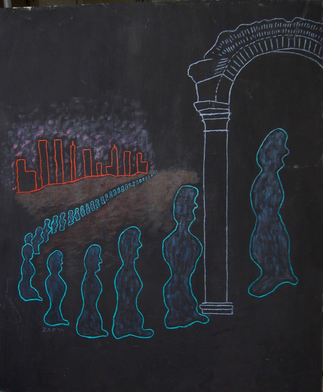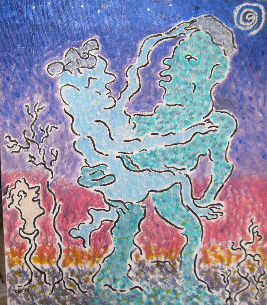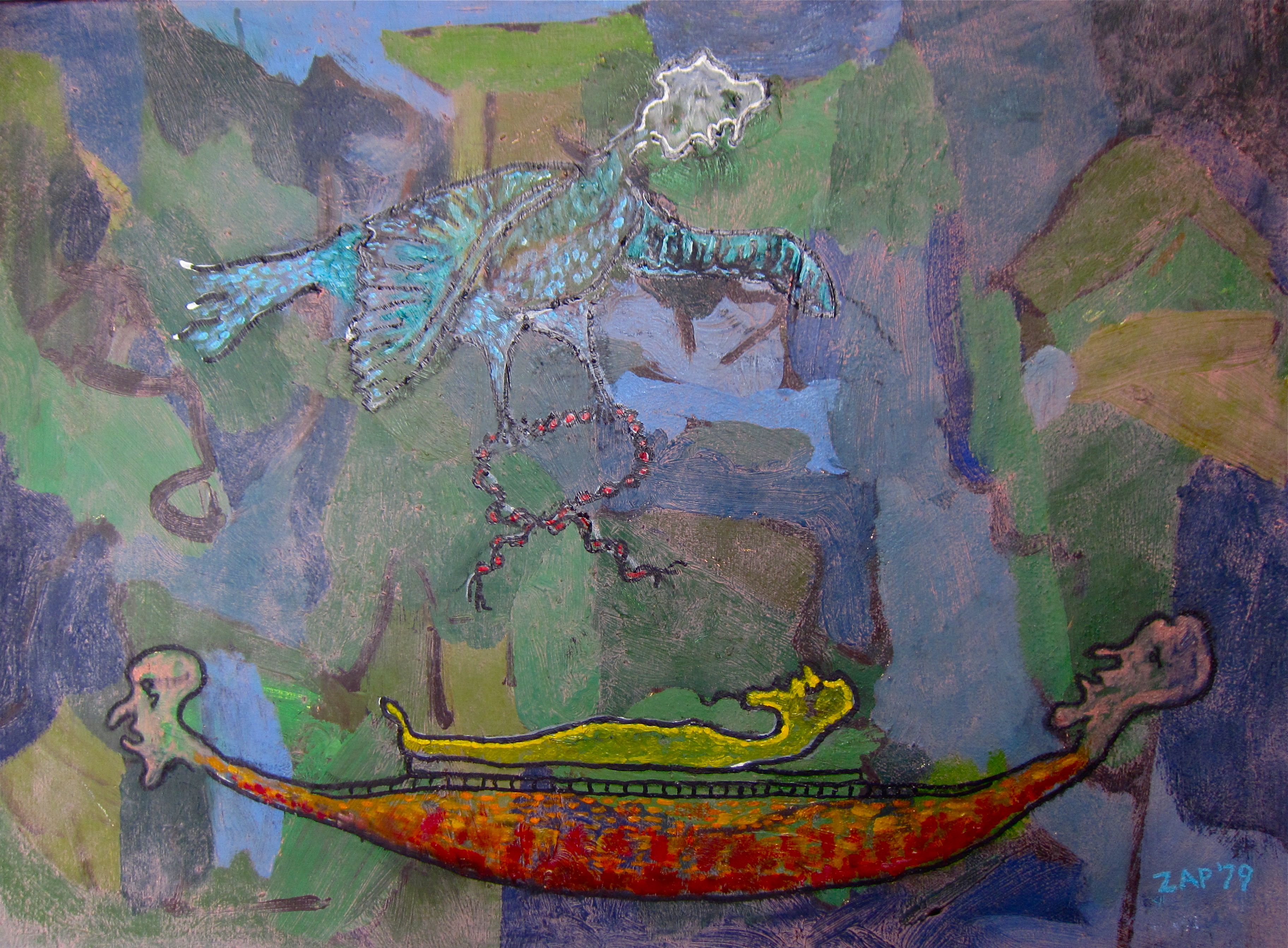 This appears to be the last painting as it is the only one I’ve found dated 1979. It is also the image where the most is known about my dad’s intentions. It was supposed to be of deceased figures crossing the river Styx. The flying figure is the angel of death.