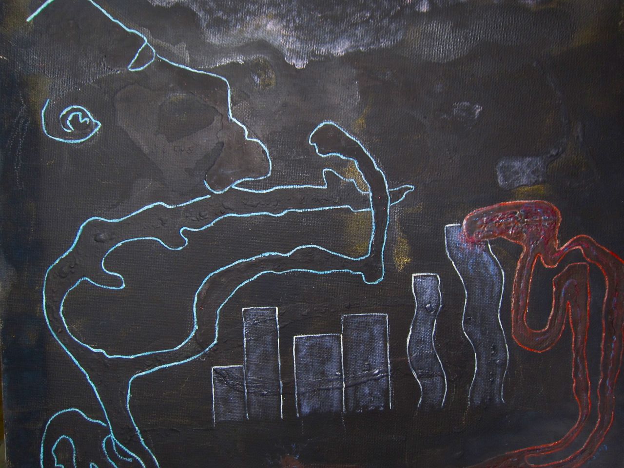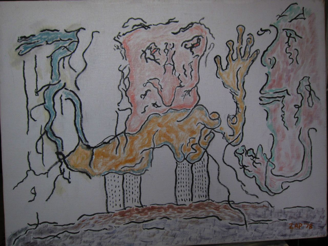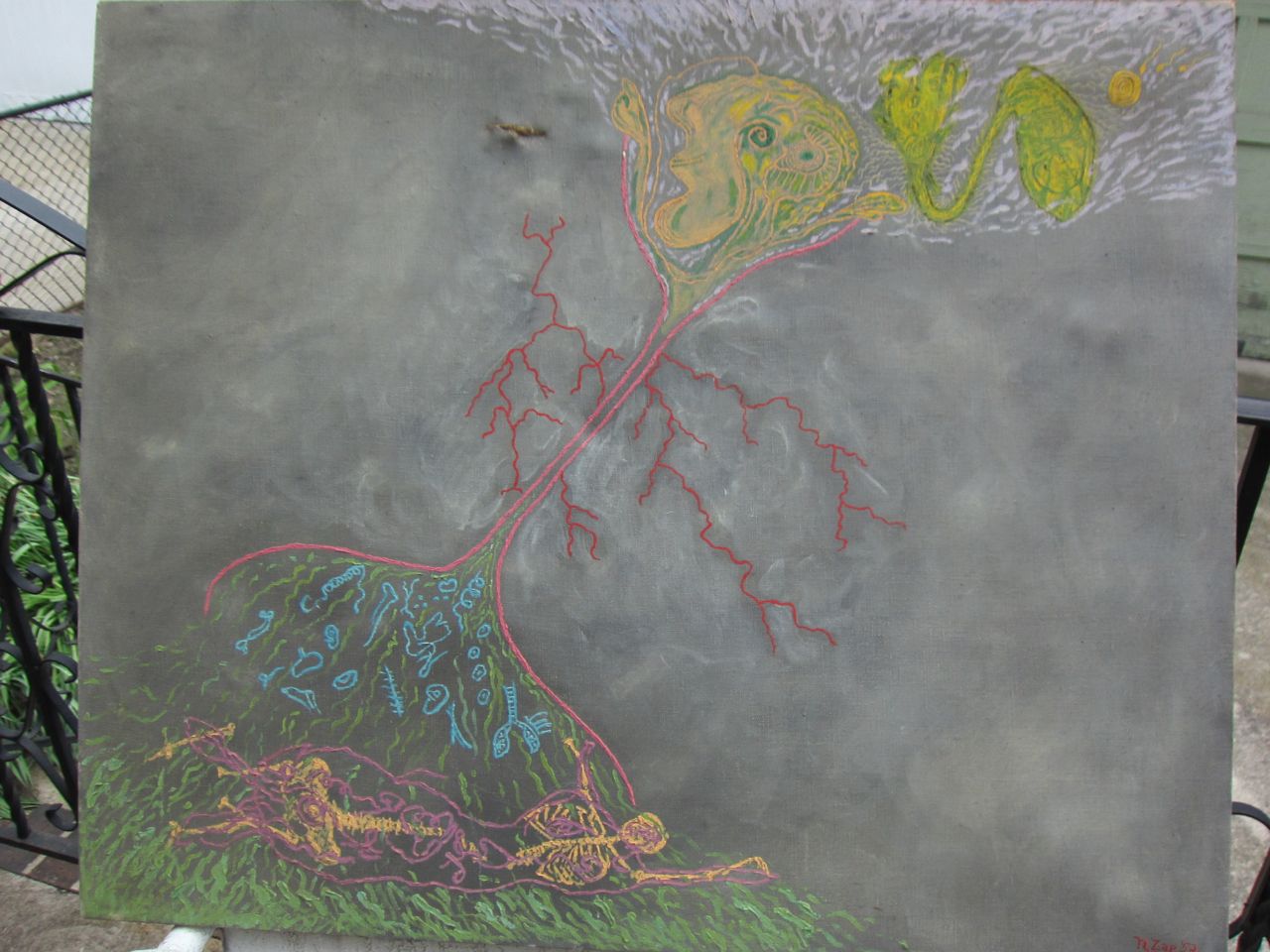 This appears to be the last painting as it is the only one I’ve found dated 1979. It is also the image where the most is known about my dad’s intentions. It was supposed to be of deceased figures crossing the river Styx. The flying figure is the angel of death.