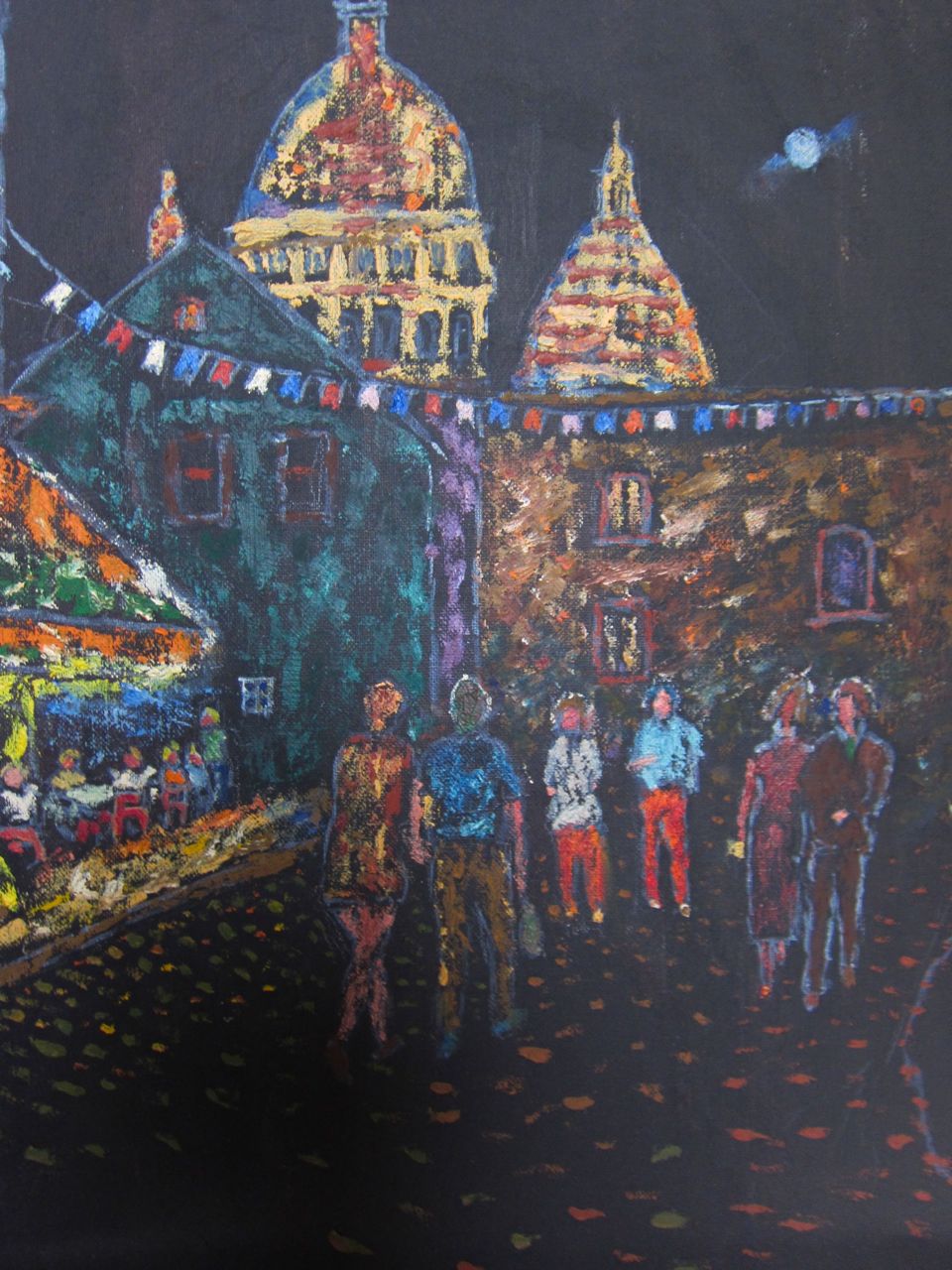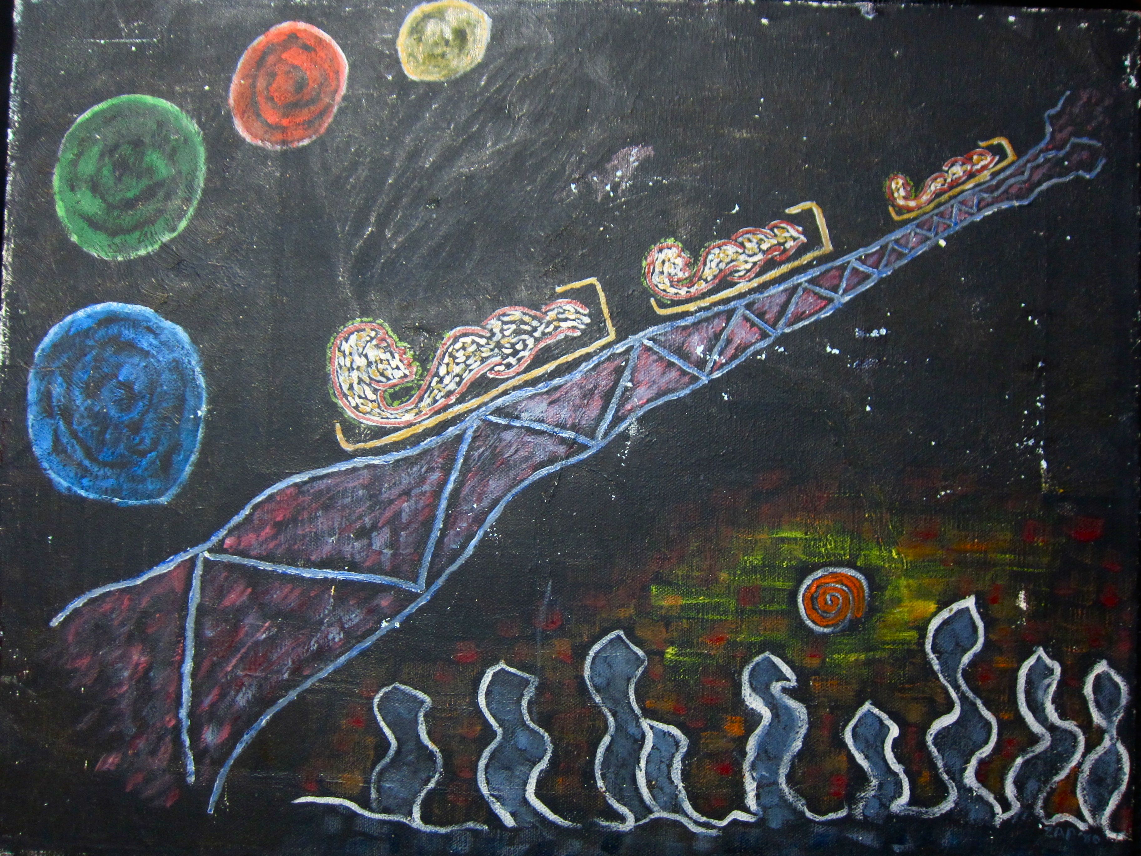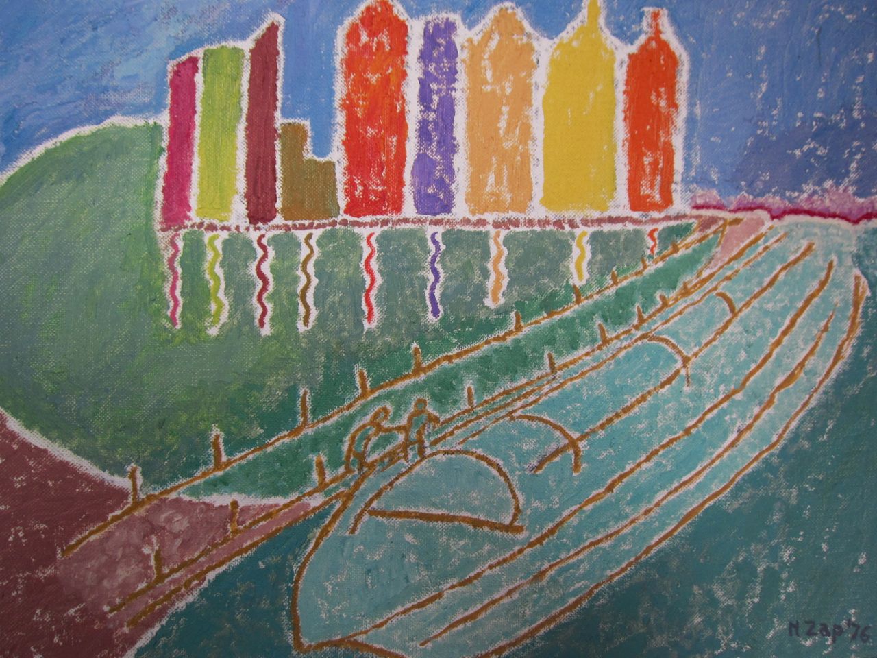 This painting was based on a Kodachrome slide I took of a roller coaster with colored lights silhouetted by a sunset. My dad asked to borrow the slide to make the painting.
