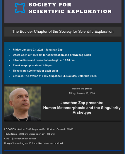 I will be giving a talk in Boulder, Jan. 23rd, at the Society for Scientific Exploration (follow link to RSVP if you’d like to attend).